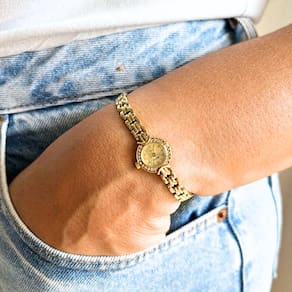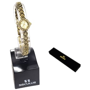 Marca: Seculus Modelo: 20091LPSVDA3 Tipo de relógio: Analógico Gênero: Feminino Cor da caixa: Dourado Cor da pulseira: Dourado Estilo: Casual Alarme: Não Cronômetro: Não Calendário: Sim Luz: Não Resistência à água: Sim – 3 ATM = 30 metros Tipo de fecho: Fecho joia Material da caixa: Aço Material da pulseira: Aço Características do vidro: Vidro mineral Tamanho da caixa: 14 mm Espessura da caixa: 6 mm Comprimento da pulseira: 19 cm Largura da pulseira: 6 mm Tampa do fundo: Pressão Peso: 17 Gramas Alimentação: Bateria Garantia do Fabricante: 24 meses Fabricante: Seculus da Amazônia Indústria e Com S/A
