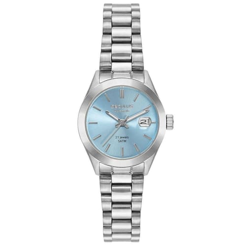 Mecanismo: Automático Movimento Miyota Cal. 6T15- 21 joias (reserva de carga de 40h) Gênero: Feminino Visor: Azul claro Vidro: Safira Funções: Calendário com lupa Prova d'água: 50m Características: Com caixa e pulseira em aço inoxidável, e case back transparente. Diâmetro da caixa: 28 mm Garantia: 2 anos pela fabricante Seculus