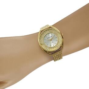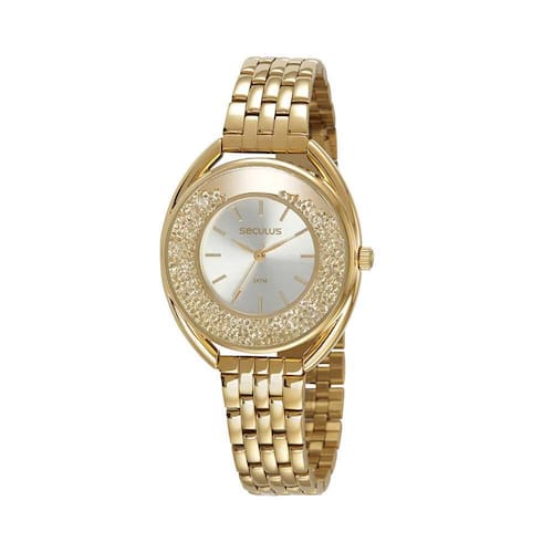 Relógio Seculus Feminino Cristais Soltos 77097LPSVDS1 Cor da pulseira: Dourado Este relógio analógico é um modelo moderno com folheação dourada. Tem caixa com cristais soltos que se movimentam conforme o movimento do pulso. Possui mostrador prata minimalista e pulseira semi sólida em aço em pequenos gomos com fecho de pressão. Por ser monocromático, é um relógio fácil de combinar.