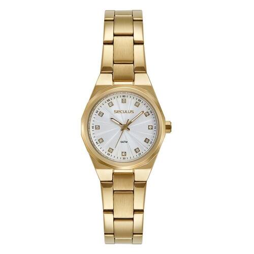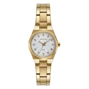 Relógio seculus feminino ref: 23733lpsvds1 clássico dourado Descrição do produto: Vidro: cristal mineral Funções: analógico Resistencia à água: 50 m Características: com caixa de metal especial e pulseira de aço inoxidável Diâmetro da caixa: 2,8 cm Fundo rosqueado Alimentação do maquinário: bateria Mostrador prateado com pedras Movimento japonês de 2 anos