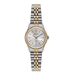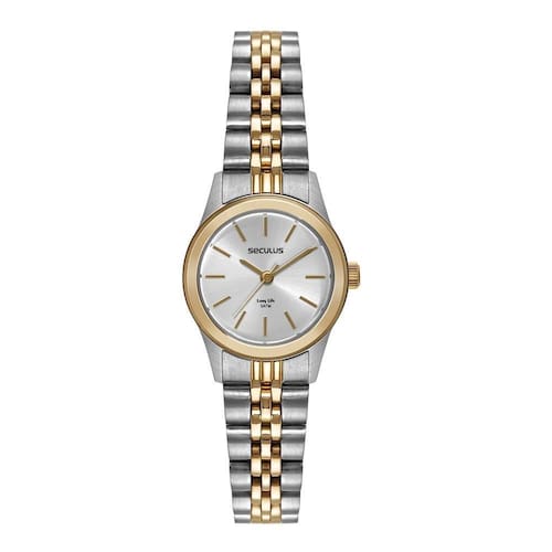 Vidro: cristal mineral Funções: analógico Resistencia à água: 50 m Características: com caixa de aço e pulseira de aço Diâmetro da caixa: 2,5 cm Fundo rosqueado Alimentação do maquinário: bateria Mostrador prateado Linha: seculus long life Prateado com dourado