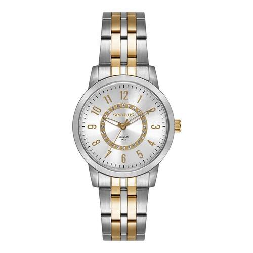 Relógio seculus feminino ref: 44289lpsvba2 casual aço bicolor Descrição do produto: Vidro: cristal mineral Funções: analógico Resistencia à água: 50 m Características: com caixa de aço e pulseira de aço Diâmetro da caixa: 3,6 cm Fundo rosqueado Alimentação do maquinário: bateria Mostrador prateado com todos os números e detalhes de pedras Linha: seculus long life Prateado com dourado de 2 anos Marca: Não Informado Ean: 7909669203902