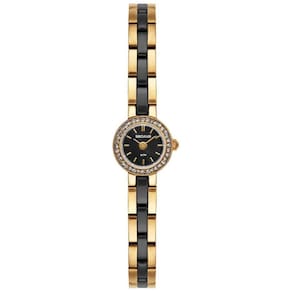 Vidro: cristal mineral Funções: bracelete, analógico Resistencia à água: 50 m Características: com caixa de metal e pulseira de metal com detalhe em resina preto Diâmetro da caixa: 1,5 cm Altura da caixa: 0,7 cm Aro externo de pedras Fundo de pressão Linha: mini relógio, mosquitinho Alimentação do maquinário: bateria Mostrador preto