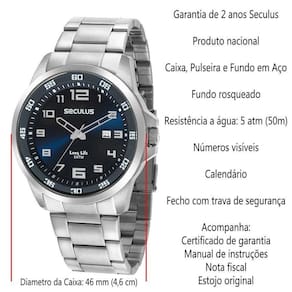 Relógio seculus masculino ref: 44011g0svna1 casual prateado Descrição do produto: Vidro: cristal mineral Funções: analógico, calendário Resistencia à água: 50 m Características: com caixa de aço inoxidável e pulseira de aço inoxidável Diâmetro da caixa: 4,6 cm Fundo de rosca Linha long life Alimentação do maquinário: bateria Mostrador azul com todos os números fácil para ver as horas Garantia de 2 anos