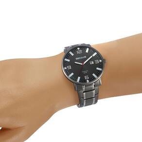 O mostrador cinza com efeito sunray transmite elegância e traz detalhes em branco e ponteiro de segundos vermelho, que acrescenta um toque esportivo ao relógio. Para maior funcionalidade, conta ainda com calendário na posição das 3h.