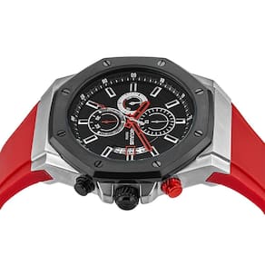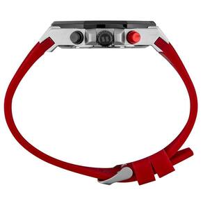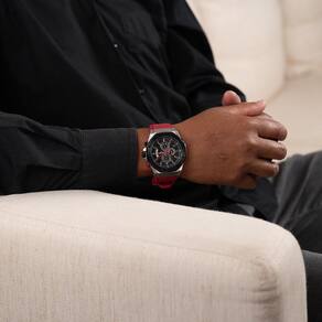 O mostrador preto traz cronógrafo funcional, calendário e ponteiros em vermelho, que reforçam a identidade esportiva do relógio e garantem ótima legibilidade. Os detalhes contrastantes e o botão lateral vermelho acentuam o design moderno e marcante.