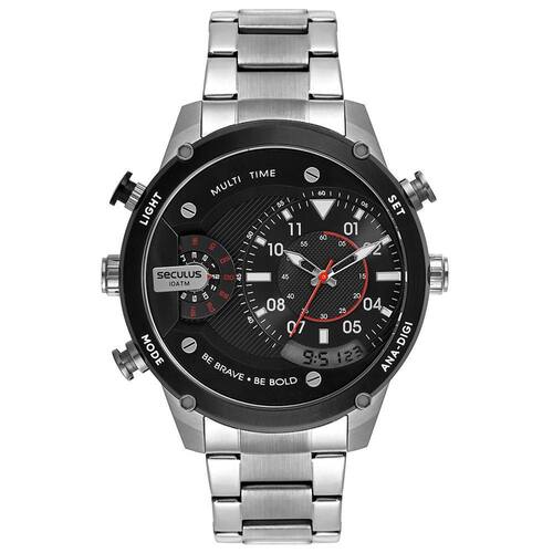 O Relógio Seculus 77303G0SVNA1 foi desenvolvido para homens que apreciam tecnologia, robustez e estilo marcante. Com caixa imponente em aço inoxidável prateado e aro preto, o modelo se destaca pelo mostrador multifuncional analógico e digital, que combina design moderno com praticidade no dia a dia.