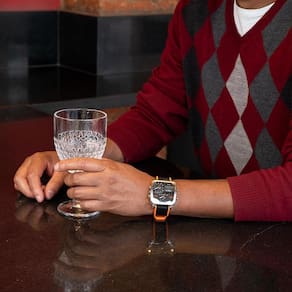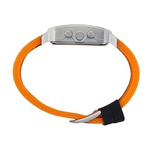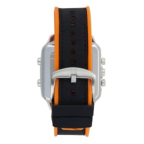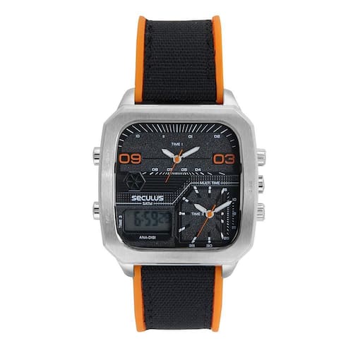 A caixa quadrada em aço com acabamento escovado traz personalidade ao modelo, enquanto o mostrador preto com detalhes em laranja reforça o estilo moderno e urbano. Conta ainda com multifuso horário (Multi Time), ideal para quem precisa acompanhar diferentes fusos, além de cronômetro, alarme e iluminação para uso em ambientes com pouca luz.