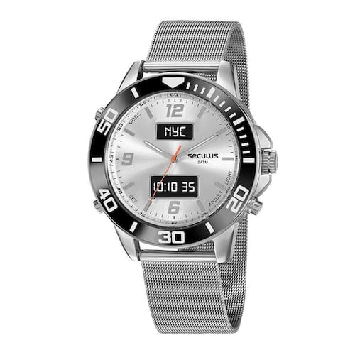 O funcionamento é Analogico/Digital, Pulseira de Aço na cor PRATA, fecho de Fecho de pressão, caixa de Aço e resistencia de 5 ATM. Especificações Marca: Seculus Modelo: 20883G0SVNA1 Gênero: Masculino Mecanismo: Analogico/Digital Material da caixa: Aço Material da pulseira: Aço Material do vidro: Cristal Mineral Cor da caixa: Cromado Cor do mostrador: LCD NEGATIVO Tamanho da caixa: 48MM Formato da caixa: Redondo Resistência à água: 5 ATM Garantia: 2 anos Tipo de fecho:Fecho de pressão Sobre a Marca: Para aqueles que valorizam design, qualidade e custo-benefício, a nossa marca é muito mais do que um acessório. É uma mostra de precisão em todos os detalhes. Design contemporâneo, versatilidade e qualidade nos produtos. São relógios para diferentes ocasiões, com 2 anos de garantia. Somos uma sólida marca de relógios que está no mercado há mais de 50 anos, e nosso maior trunfo é a atemporalidade. Sempre em busca de inovações, trazemos a modernidade em nossos modelos e ressaltamos a personalidade confiante, forte e segura de quem os usa. Produzimos relógios femininos e masculinos, alinhados ao estilo de vida dos nossos clientes, resultando em peças autênticas e versáteis. Marca: Seculus Relógios