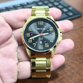 Marca: Seculus Modelo: 20807GPSVDA2 Tipo de relógio: Analógico Gênero: Masculino Cor da caixa: Dourado Cor da pulseira: Dourado Estilo: Casual Alarme: Não Cronômetro: Não Calendário: Sim Luz: Não – ponteiros fluorescentes Resistência à água: Sim – 5 ATM = 50 metros Tipo de fecho: Dobrável, com trava de segurança Material da caixa: Aço Material da pulseira: Aço Características do vidro: Cristal Mineral Tamanho da caixa: 46 mm Espessura da caixa: 12 mm Comprimento da pulseira: 25 cm Largura da pulseira: 22 mm Tampa do fundo: Rosqueado Peso: 130 Gramas Alimentação: Bateria Garantia do Fabricante: 24 meses Fabricante: Seculus da Amazônia Ind e Com S/A