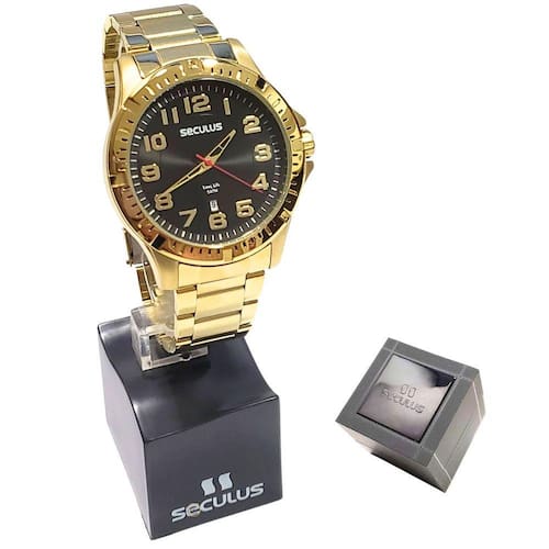 Marca: Seculus Modelo: 20787GPSVDA3 Tipo de relógio: Analógico Gênero: Masculino Cor da caixa: Dourado Cor da pulseira: Dourado Estilo: Casual Alarme: Não Cronômetro: Não Calendário: Sim Luz: Não Resistência à água: Sim – 5 ATM = 50 metros Tipo de fecho: Dobrável, com trava de segurança Material da Caixa: Aço Inoxidável Material da Pulseira: Aço Inoxidável Tamanho da Caixa: 45 mm Espessura da caixa: 11 mm Comprimento da Pulseira: 24 cm Largura da Pulseira: 20 mm Peso: 124 gramas Tampa do fundo: Rosqueado Alimentação: Bateria Garantia do Fabricante: 12 meses Fabricante: Seculus da Amazônia Ind e Com S/A