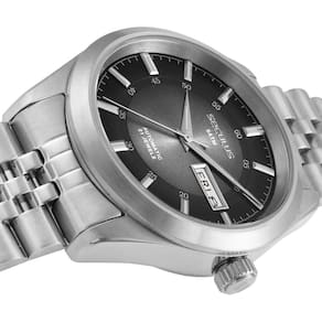 Sua caixa em aço inoxidável de 38 mm abriga um mostrador com efeito gradiente, que cria profundidade visual e valoriza o conjunto. Os marcadores metálicos aplicados e os ponteiros bem definidos garantem excelente legibilidade, enquanto o calendário posicionado às 3 horas acrescenta praticidade ao uso cotidiano.