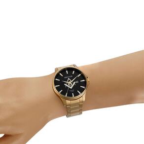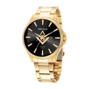 Este relógio analógico com calendário é um modelo clássico e sofisticado. Todo em aço, o relógio possui folheação dourada e tem mostrador minimalista texturizado com o símbolo da maçonaria. É um relógio democrático, que veste bem todos os tamanhos de pulso. Esse relógio possui a caixa em 4,6 cm de tamanho.