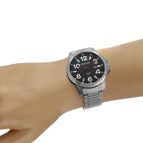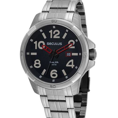 Formato da Caixa: Redondo Marcas: Seculus Gênero: Masculino Cor: Prata Tamanho da Caixa: Grande Material da Pulseira: Aço Mecanismo: Analógico Pulseira Ajustável: Sim Material da Caixa: Aço Dimensões da Caixa: Material do Vidro: Cristal Mineral Nível de Resistência à Água: 5 ATM Calendário: Calendário Analógico com Data Marca: Não Informado