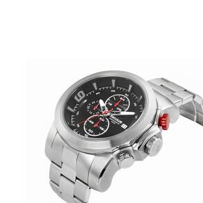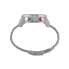 A pulseira deste relógio é fabricada em aço na cor prata, proporcionando durabilidade e resistência. Com 26 cm de comprimento, se ajusta perfeitamente ao seu pulso e possui fecho dobrável com trava, garantindo segurança e conforto durante o uso.