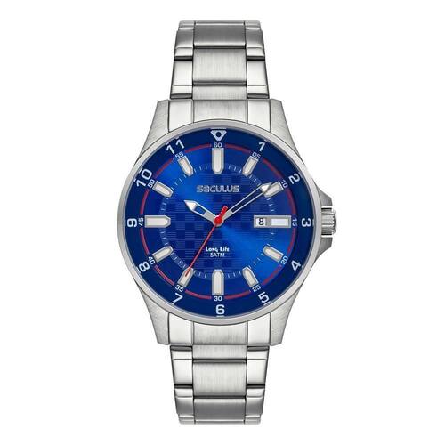 Relógio seculus masculino ref: 23727g0svna1 esportivo prateado Descrição do produto: Vidro: cristal mineral Funções: analógico, calendário Resistencia à água: 50 m Características: com caixa de aço inoxidável e pulseira de aço inoxidável Diâmetro da caixa: 4,4 cm Fundo de rosca Linha long life Alimentação do maquinário: bateria Mostrador azul Aro interno do mostrador azul com números Movimento japonês de 2 anos