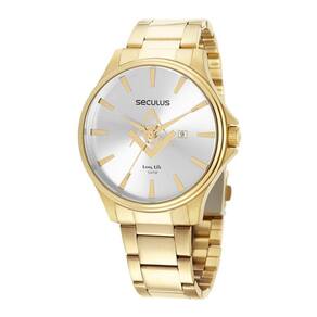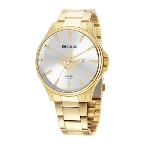 Relógio seculus masculino ref: 44116gpsvda1 maçonaria dourado Descrição do produto: Vidro: cristal mineral Funções: analógico, calendário Resistencia à água: 50 m Características: com caixa de aço inoxidável e pulseira de aço inoxidável Diâmetro da caixa: 4,6 cm Fundo de rosca Linha long life Alimentação do maquinário: bateria Mostrador prateado com símbolo da maçonaria de 2 anos Marca: Não Informado