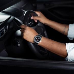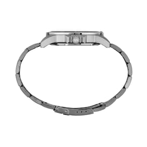Vidro: cristal mineral Funções: analógico, calendário Resistencia à água: 50 m Características: com caixa de aço inoxidável e pulseira de aço inoxidável Diâmetro da caixa: 4,5 cm Fundo de rosca Linha long life Alimentação do maquinário: bateria Mostrador preto Aro prateado fixo