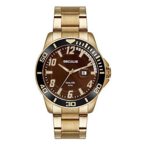 Relógio seculus masculino ref: 44211gpsvda3 esportivo dourado Descrição do produto: Vidro: cristal mineral Funções: analógico, calendário Resistencia à água: 50 m Características: com caixa de aço inoxidável e pulseira de aço inoxidável Diâmetro da caixa: 4,7 cm Fundo de rosca Linha long life Alimentação do maquinário: bateria Mostrador marrom com números e detalhes em branco Aro fixo preto de 2 anos