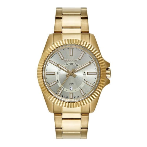 Relógio seculus masculino ref: 44264gpsvda2 casual dourado Descrição do produto: Vidro: cristal mineral Funções: analógico, calendário Resistencia à água: 50 m Características: com caixa de aço inoxidável e pulseira de aço inoxidável Diâmetro da caixa: 4,2 cm Fundo de rosca Linha long life Alimentação do maquinário: bateria Mostrador dourado de 2 anos