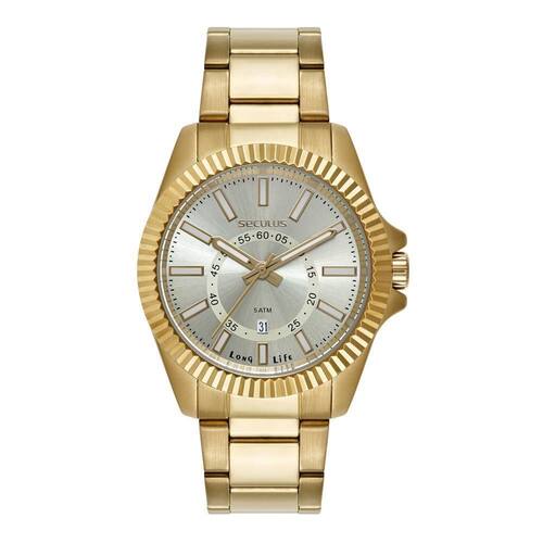 Relógio seculus masculino ref: 44264gpsvda2 casual dourado Descrição do produto: Vidro: cristal mineral Funções: analógico, calendário Resistencia à água: 50 m Características: com caixa de aço inoxidável e pulseira de aço inoxidável Diâmetro da caixa: 4,2 cm Fundo de rosca Linha long life Alimentação do maquinário: bateria Mostrador dourado de 2 anos Ean: 7909669198857