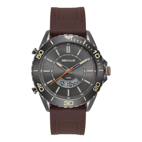 Características: com caixa de Aço inoxidável e pulseira de Silicone Marrom