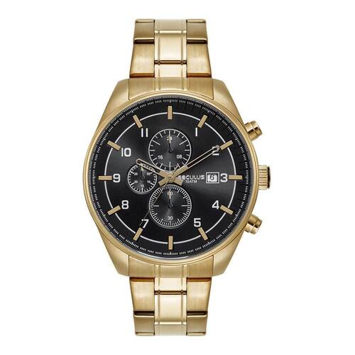 Relógio seculus masculino ref: 44272gpsvda2 cronógrafo dourado Descrição do produto: Vidro: cristal mineral Funções: cronógrafo, calendário, analógico Resistencia à água: 100 m Características: com caixa de aço inoxidável e pulseira de aço inoxidável Diâmetro da caixa: 4,6 cm Fundo de rosca Alimentação do maquinário: bateria Mostrador preto com números de 2 anos