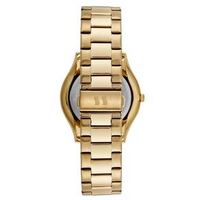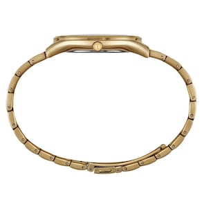 Vidro: cristal mineral Funções: analógico, calendário Resistencia à água: 50 m Características: com caixa de aço inoxidável e pulseira de aço inoxidável Diâmetro da caixa: 4,4 cm Espessura da caixa: 9 mm Fundo de pressão Alimentação do maquinário: bateria Mostrador dourado