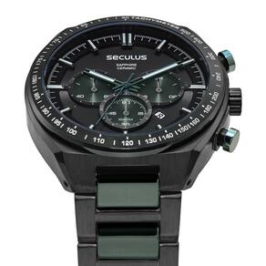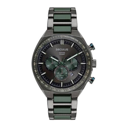 Características: com caixa de Aço inoxidável e pulseira de Aço Inoxidável Preto e Detalhes em Cerâmica Verde