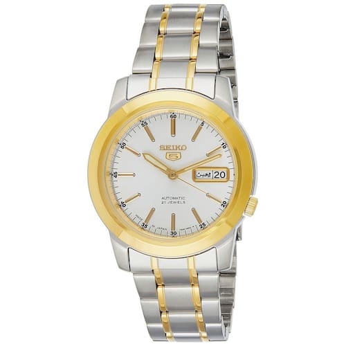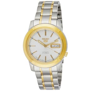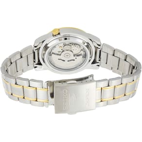 Características: Caixa de aço inoxidável Pulseira de aço inoxidável de dois tons Calibre de movimento automático: 7S26 21 joias Hardlex Crystal Silver Display analógico Mãos e marcadores luminosos Display de dia e data Exibição transparente da caixa traseira Fecho de implantação resistente a respingos Diâmetro aproximado da caixa: 35 mm Espessura aproximada da caixa: 10 mm