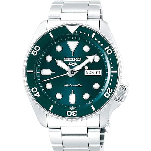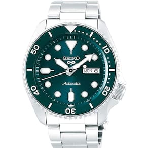 Mostre seu estilo. Faça sua jogada. Por mais de 50 anos, a Seiko 5 Sports oferece níveis consistentemente altos de confiabilidade, durabilidade e desempenho. Para uma cronometragem confiável em sua vida cotidiana, o excepcional relógio esportivo masculino SRPD61 é alimentado por um movimento automático com uma reserva de marcha de aproximadamente 41 horas e possui um calendário de dia/data, ponteiros e marcadores LumiBrite e um fundo de caixa transparente. Com uma caixa e pulseira duráveis de aço inoxidável e um lindo mostrador verde de raios de sol emoldurado por uma luneta giratória verde, este relógio versátil é resistente à água de 100 metros, perfeito para seu estilo, não importa o que seu dia lhe reserva.