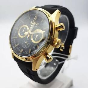 Características Formato do relógio: redondo Composição do vidro: safira Material da caixa: aço inox Cor da caixa: dourado Cor do mostrador: preto Material da pulseira: borracha Cor da pulseira: preto Mecanismo: analógico multifunção