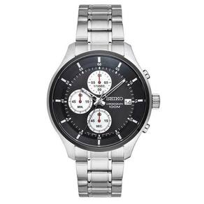 Caixa de aço inoxidável com uma pulseira de aço inoxidável. Bezel fixo de aço inoxidável. Mostrador preto com ponteiros prateados e marcadores de horas de índice. Marcadores de minutos em torno de um anel interno. Tipo de discagem: analógico. Exibição da data na posição das 3 horas. Cronógrafo - três submostradores brancos exibindo: 60 segundos, 60 minutos e 1/10 de segundo. Movimento de quartzo. Cristal hardlex resistente a riscos. Estojo sólido de volta. Tamanho da caixa: 43 mm. Espessura da caixa: 12 mm. Forma de caixa redonda. Largura da pulseira: 20 mm. Fecho de implantação. Resistente à água a 100 metros / 330 pés. Funções: cronógrafo, data, hora, minuto, segundo. Estilo de relógio esportivo. Relógio seiko neo sports black dial cronógrafo masculino sks545.