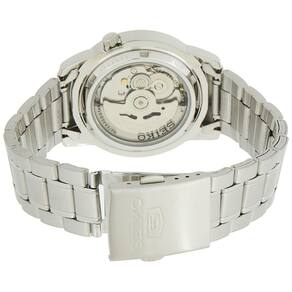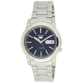 Mostrador azul. Caixa de aço inoxidável prateado com uma pulseira de aço inoxidável prateada. Movimento automático. Resistência à água até 30 metros. Bisel fixo. Dobre com fecho de liberação de segurança. Tamanho da caixa: 39 mm x 11 mm. Relógio Seiko SNKE51 Seiko 5.