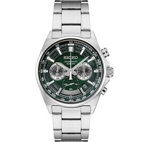 Relógio masculino SEIKO SSB405 — Essentials — com anel taquimétrico preto, mostrador verde com detalhes em cinza, indicador de data, caixa e pulseira de aço inoxidável e 100 m resistente à água