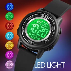 Introdução do produto Este relógio esportivo digital foi projetado para crianças, meninos, meninas e crianças. Pulseira de PU de alta qualidade e não tóxica, além de excelente acabamento, este relógio oferece grande suavidade e conforto. Características do produto O display digital oferece conveniência para aprender, e o relógio é leve e adequado para pulsos pequenos. Movimentos eletrônicos inovadores: forneça um tempo preciso. Pulseira de gel de sílica de alta qualidade. Vidro de resina de alta transparência, não é fácil de usar. 50m à prova d'água: você pode usá-lo para lavar as mãos ou tomar banho, mas nunca apertar nenhum botão na água ou colocá-lo em água quente. Aparência moderna e ótima durabilidade, este relógio parece muito mais caro do que realmente é. Resistente a choques e a arranhões nas teclas: perfeito para esportes ao ar livre e em ambientes fechados. Multifuncional: janela de calendário com data, semana, alarme, 12/24H, 50M à prova d'água, display de luz de fundo EL, à prova de choque, cronógrafo de 1/100 segundos. Especificação Diâmetro do mostrador: 1,34 pol/3,4 cm Espessura da caixa: 0,47 pol/1,2 cm Largura da pulseira: 0,55 pol/1,4 cm Comprimento da pulseira: 9,25 pol/23,5 cm Comprimento do pulso: 6,5-8,3 pol/16,5-21,0 cm Peso do produto: 0,81 onças/23 G Tipo de fecho: fivela Tipo de material: gel de sílica Material da caixa: ABS Nota: Impermeável (50 metros), não adequado para muito tempo debaixo d'água atividades como mergulho. Por favor, NÃO PRESSIONE nenhum botão debaixo d'água Pacote: Kids Digital Sports Watch × 1 caixa de presente × 1 manual de instruções × 1