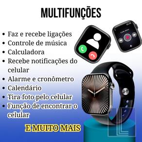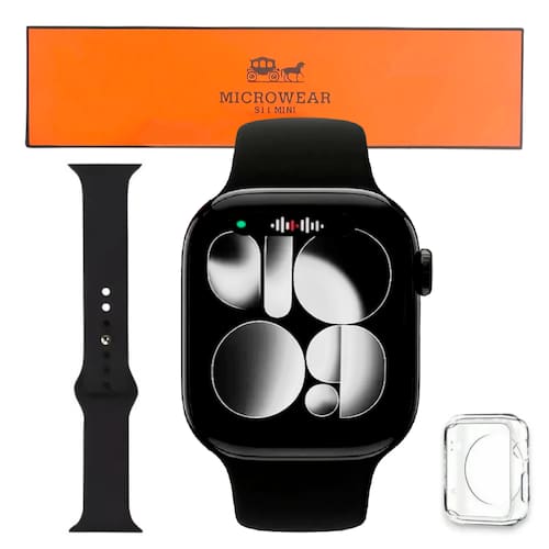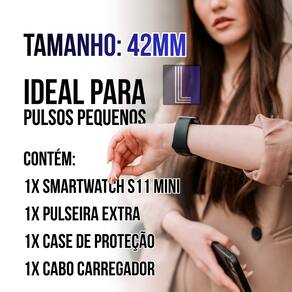 Smartwatch S11 Mini 2026 com design moderno e tamanho compacto. Caixa de 42mm com estrutura reforçada. Realiza e atende chamadas, exibe notificações de aplicativos e permite interação com mensagens. Possui armazenamento interno, múltiplos modos de atividade, comando por voz, controle de câmera, ferramentas de localização, ajustes de som ambiente, exercícios de respiração, atalho de segurança, controle de músicas, modo silencioso, calculadora, cronômetro, alarme e clima. Tela de 1.85” com resolução 410x480 pixels, sensível ao toque. Sistema S26 com processador JL7012F7. Bateria de 375 a 450mAh com carregamento médio de até 2 horas. Compatível com diversos smartphones. Proteção contra respingos e suor (não indicado para submersão).Processador