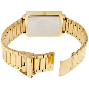 Mostrador cor: branca, Formato da capa: retangular cor da pulseira: Ouro, material da pulseira: aço inoxidável tipo de movimento do relógio: quartzo, relógio analógico tipo de exibição: resistência à água profundidade: 30 meters 1 ano de garantia