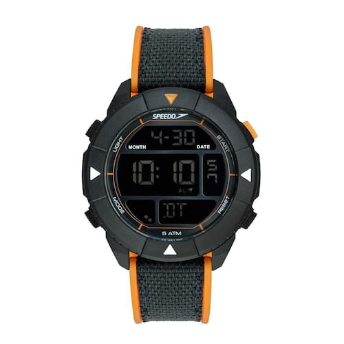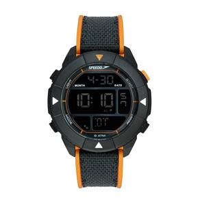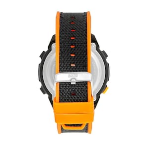 Características: com caixa em Policarbonato Preta e pulseira em Silicone Laranja com detalhe em nylon preto