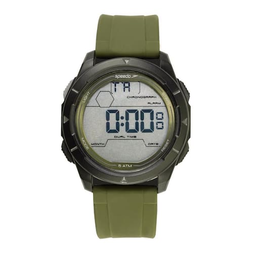 Relógio speedo masculino ref: 15106g0evnv4 esportivo digital Descrição do produto: Funções: digital, iluminação, alarme, cronógrafo, timer, dual time Resistência à água: 50 m Diâmetro da caixa: 47 mm Características: com caixa em policarbonato preto e pulseira em silicone verde/preto Fundo parafusado Vidro: acrílico Aro fixo preto Alimentação do maquinário: bateria de 1 ano Marca: Não Informado