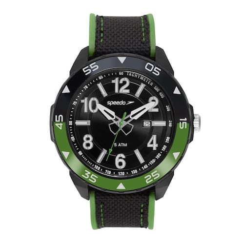 Relógio speedo masculino ref: 15108g0evnv3 esportivo analógico Descrição do produto: Funções: analógico, calendário Resistência à água: 50 m Diâmetro da caixa: 50 mm Características: com caixa em policarbonato preto e pulseira em silicone verde com detalhe em tecido preto Fundo parafusado Vidro: acrílico Alimentação do maquinário: bateria Aro fixo preto/verde Mostrador preto com números e detalhes em branco de 1 ano Marca: Não Informado