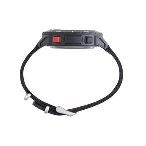 Funções: anadigi, iluminação, alarme, cronógrafo Resistência à água: 50 m Diâmetro da caixa: 51 mm Características: com caixa em policarbonato preta e pulseira em tecido preto/vermelho Fundo parafusado Vidro: acrílico Alimentação do maquinário: bateria Mostrador preto Garantia de 1 ano