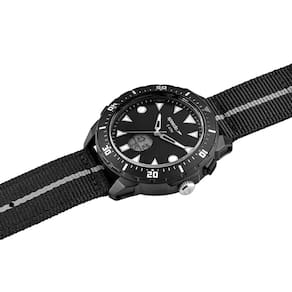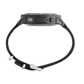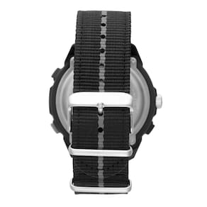 Características: com caixa em Policarbonato Preta e pulseira em tecido preto/cinza