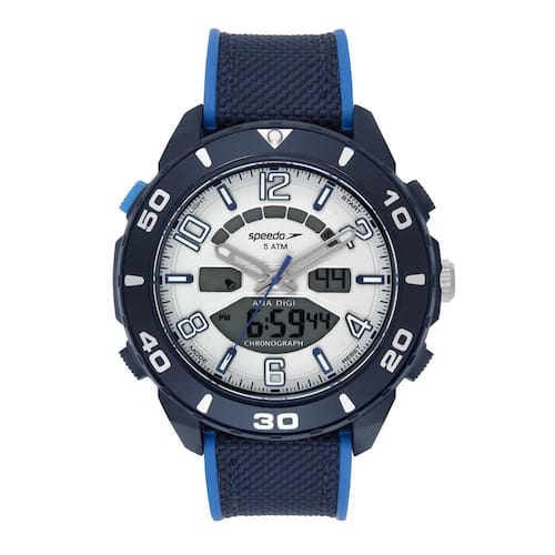 Relógio speedo masculino ref: 15131g0evnv3 esportivo anadigi azul Descrição do produto: Funções: anadigi, iluminação, alarme, cronógrafo Resistência à água: 50 m Diâmetro da caixa: 51 mm Características: com caixa em policarbonato azul e pulseira em silicone azul claro com detalhe em tecido azul escuro Fundo parafusado Vidro: acrílico Alimentação do maquinário: bateria Mostrador prateado com números e detalhes em azul Aro fixo azul com números de 1 ano