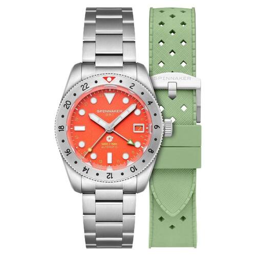 Relógio Spinnaker Croft GMT Automatic Flame Red SP-5157-33 Um clássico pronto para o mergulho, reinventado em tons vibrantes de verão. Agora em 39mm, com movimento GMT automático japonês e lente revestida de safira. Viaje com mais inteligência, e com estilo - O aro giratório de 24 horas acompanha até 3 fusos horários, enquanto o Swiss Super-Luminova garante visibilidade de dia ou de noite. Especificações Técnicas Mecanismo: GMT Automático Japonês Seiko NH34 Material da caixa: Aço Inoxidável Diâmetro da Caixa: 39mm Expessura da Caixa: 13mm Lug to Lug: 47mm Lente: Lente de safira com revestimento anti-reflexo Moldura: moldura unidirecional Cor do Mostrador: Laranja Flame Pulseira: pulseira de aço inoxidável de 20 mm com fivela dobrável e botão Pulseira Extra: pulseira de borracha verde de 20 mm Funções: aro rotativo unidirecional, calendário e GMT. Resistência à água: 150m : Internacional de 2 anos. Marca: Não Informado