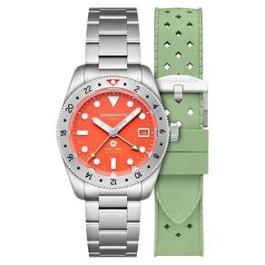Relógio Spinnaker Croft GMT Automatic Flame Red SP-5157-33 Um clássico pronto para o mergulho, reinventado em tons vibrantes de verão. Agora em 39mm, com movimento GMT automático japonês e lente revestida de safira. Viaje com mais inteligência, e com estilo - O aro giratório de 24 horas acompanha até 3 fusos horários, enquanto o Swiss Super-Luminova garante visibilidade de dia ou de noite. Especificações Técnicas Mecanismo: GMT Automático Japonês Seiko NH34 Material da caixa: Aço Inoxidável Diâmetro da Caixa: 39mm Expessura da Caixa: 13mm Lug to Lug: 47mm Lente: Lente de safira com revestimento anti-reflexo Moldura: moldura unidirecional Cor do Mostrador: Laranja Flame Pulseira: pulseira de aço inoxidável de 20 mm com fivela dobrável e botão Pulseira Extra: pulseira de borracha verde de 20 mm Funções: aro rotativo unidirecional, calendário e GMT. Resistência à água: 150m : Internacional de 2 anos. Marca: Não Informado