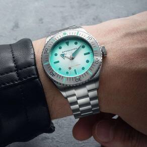Relógio Spinnaker Spence 300 Automatic Aquamarine SP-5097-AA O Spence 300 é um relógio notável. Não em peso, não em tamanho, mas na precisão absoluta de sua engenharia. O design cuidadosamente considerado e o acabamento montado à mão resultam em um relógio com apenas 10,9 mm de espessura, mas capaz de resistir a mais de 300 m de resistência à água. Cuidadosamente considerado e engenhosamente projetado, o Spence reúne proporções, desempenho e precisão para o que consideramos um dos melhores relógios de mergulho sempre vestíveis da atualidade. Com uma espessura de caixa líder do setor de 10,9 mm contra 300 metros de resistência à água, o Spence está pronto para causar um impacto sem esforço, mas com força. Especificações Técnicas Mecanismo: Japão Miyota 9039 Automático Material da caixa: Aço Inoxidável Diâmetro da Caixa: 40mm Expessura da Caixa: 10.9mm Lug to Lug: 48mm Lente: Lente de safira com revestimento anti-reflexo Moldura: moldura unidirecional com placa de alumínio verde Cor do Mostrador: Azul Pulseira: pulseira de aço inoxidável de 20 mm com fivela dobrável e botão Faixa Extra: pulseira de borracha bege de 20 mm Funções: aro rotativo unidirecional, calendário duplo Resistência à água: 300m : Internacional de 2 anos. Marca: Não Informado