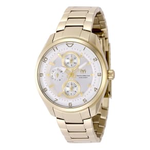 Mostrador prateado aprimorado por ponteiros dourados. Caixa de aço inoxidável dourado com uma pulseira de metal dourado e aço inoxidável. Movimento de quartzo. Resistência à água de 100 metros/330 pés. Moldura fixa. Cristal mineral. Fundo de caixa sólido. Fecho dobrável. Puxe/empurre a coroa. Tamanho da caixa 36 mm x 10,25 mm. Banda de 18 mm x 6,75 polegadas de comprimento. Relógio Technomarine TM-318110 OCEAN.
