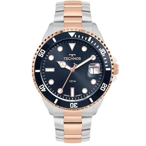 Mecanismo: Máquina Quartz Japonesa Miyota Gênero: Masculino Visor: Azul Vidro: Cristal Mineral Funções: Vidro com Lupa de calendário Prova d'água: 150m Características: Com caixa e pulseira em aço inoxidável Diâmetro da caixa: 45 mm Garantia: 1 ano pelo fabricante Technos