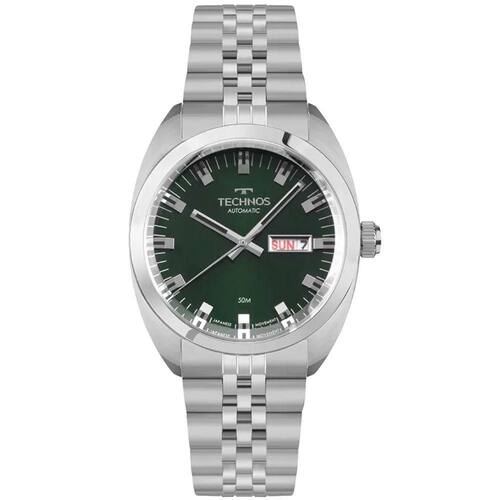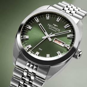 Mecanismo: Automático - Miyota com 21 Jewels - Reserva de marcha de 42h. Gênero: Masculino Visor: Verde Vidro: Cristal Mineral Funções: Calendário day-date, case back transparente Prova d'água: 50m Características: Com caixa e pulseira em aço inoxidável Diâmetro da caixa: 40 mm Garantia: 1 ano pelo fabricante Technos